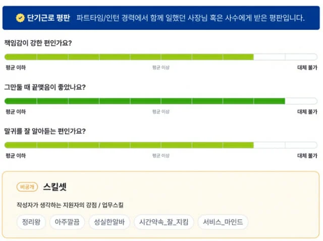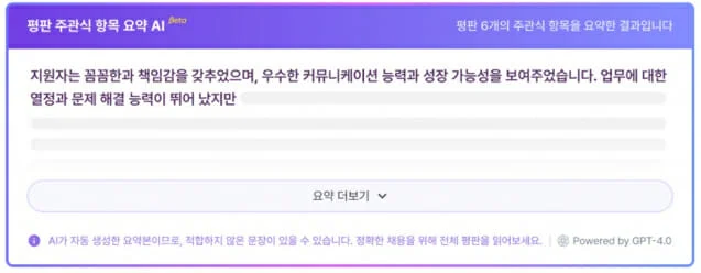 더불어 구직자가 받은 평판의 주관식 항목을 AI가 요약해주는 '주관식 항목 요약 AI' 기능의 베타 버전도 선보였다. 해당 기능은 비공개 평판을 제외한 모든 종류의 평판에서 작성자가 쓴 주관식 답변을 취합해 공통 항목 중심으로 요약해 제공한다.