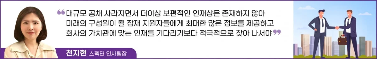 신입사원 연수를 통해 회사가 바라는 인재로 육성하고자 노력하기보다는, ‘즉시 전력’으로 활용할 수 있는 인재를 선호한다는 점 또한 기업의 채용 형태가 바뀌는 데 큰 영향을 주었다. 과거 마이리얼트립의 이동건 대표는 인터뷰에서 ‘회사와 맞지 않는 사람을 영입했을 때’ 사업 위기를 맞았다고 밝힌 바 있다. 남다른 조직문화로 주목받은 우아한형제들의 김봉진 창업자도 ‘경영자가 해야 할 일 중 하나가 좋은 인재를 영입하는 것’이라고 말했듯이 요즘 기업들은 필요한 시기에 적절한 인력을 채용하기 위해 분야별로 다양한 기준에 따라 채용을 진행하고 있다. ‘맞춤형 인재’, ‘회사의 조직 문화에 적합한 인재’를 뽑으려는 것이다.
