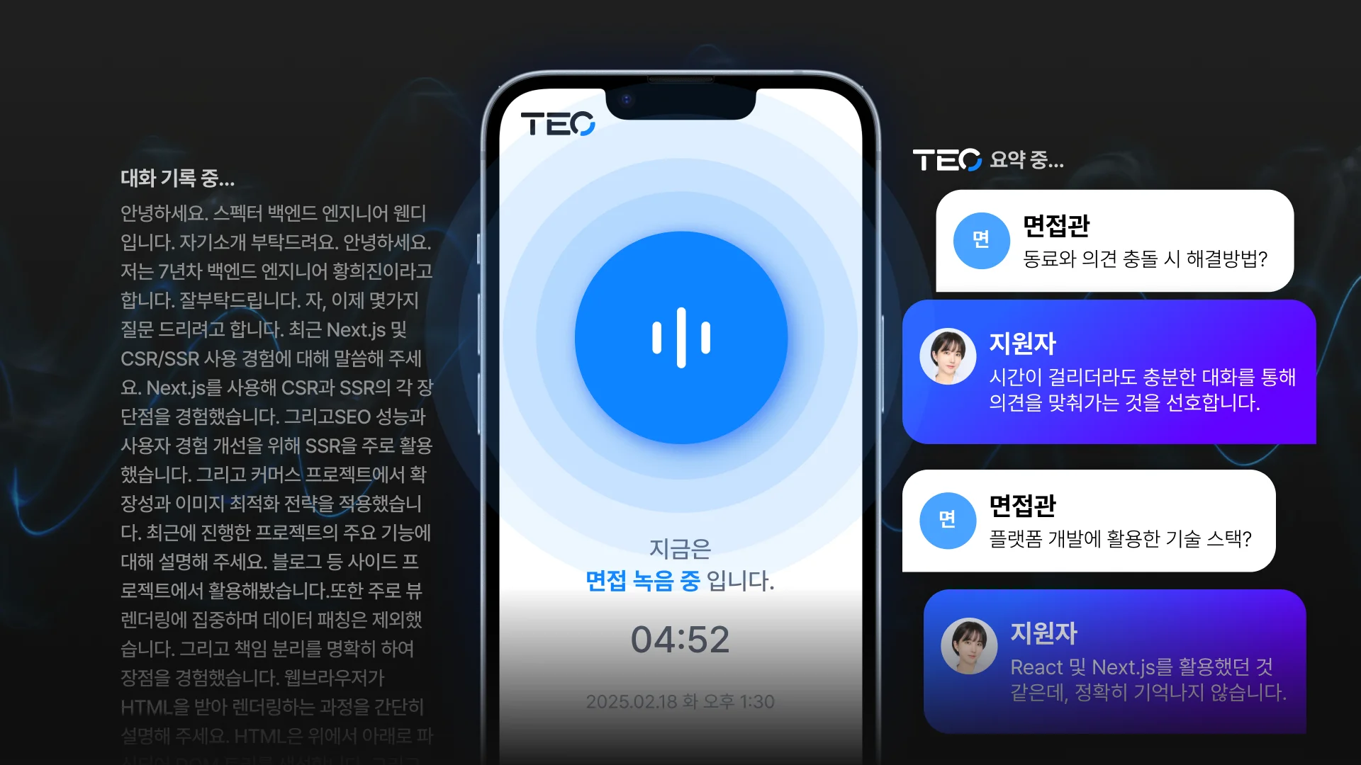 어떤 질문을 언제 했는지, 지원자가 이런 답변을 했을 때 뭐라고 질문했었는지, 항상 정확하게 기억하기는 어려워요. TEO는 면접관과 지원자가 나눈 중요한 대화를 질문, 답변으로 구분해 정리해 드립니다.