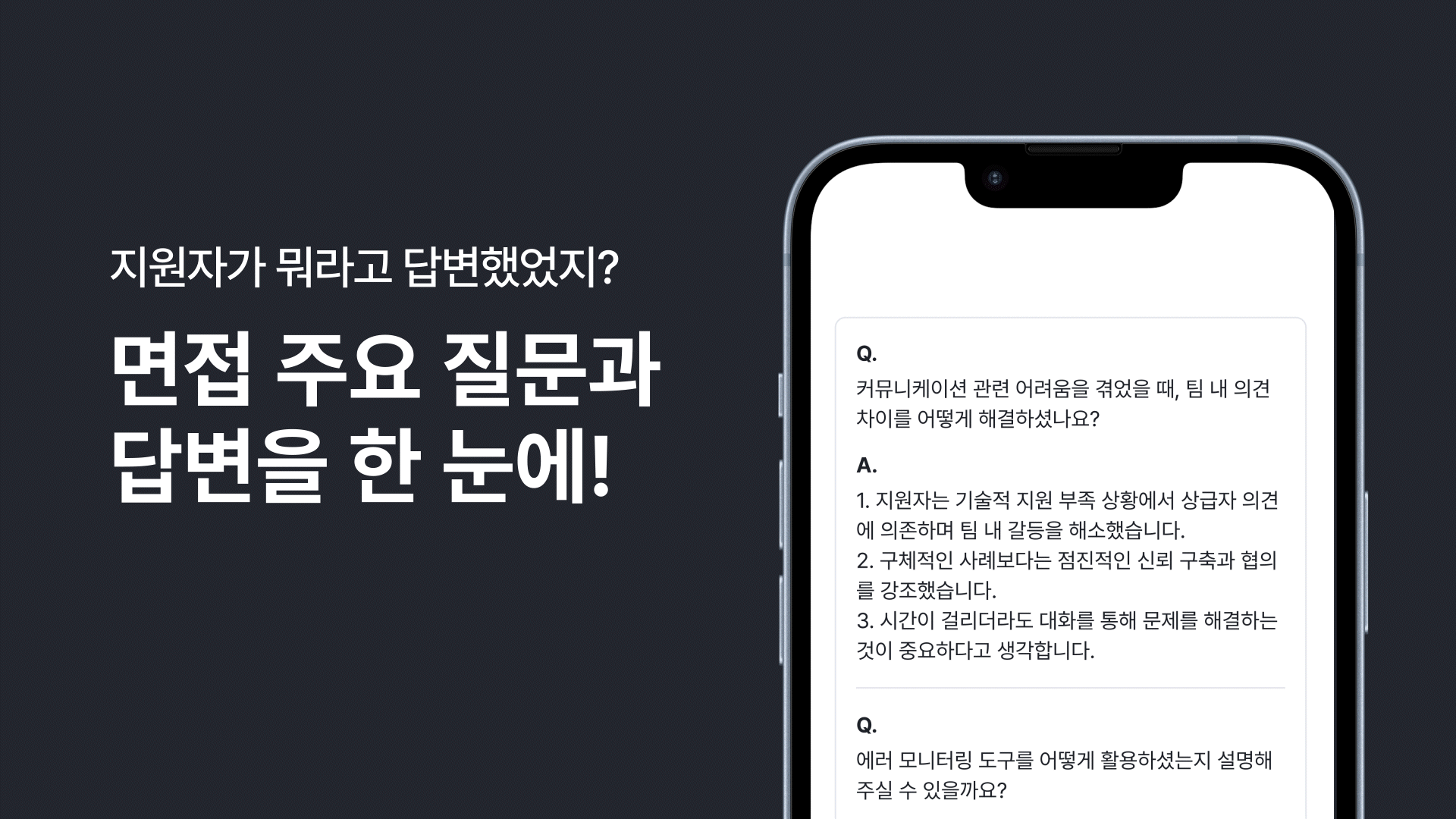 면접을 진행한 포지션 명과 실제 진행된 질문과 답변을 분석하여 더 적합한 질문을 추천해 드려요.
