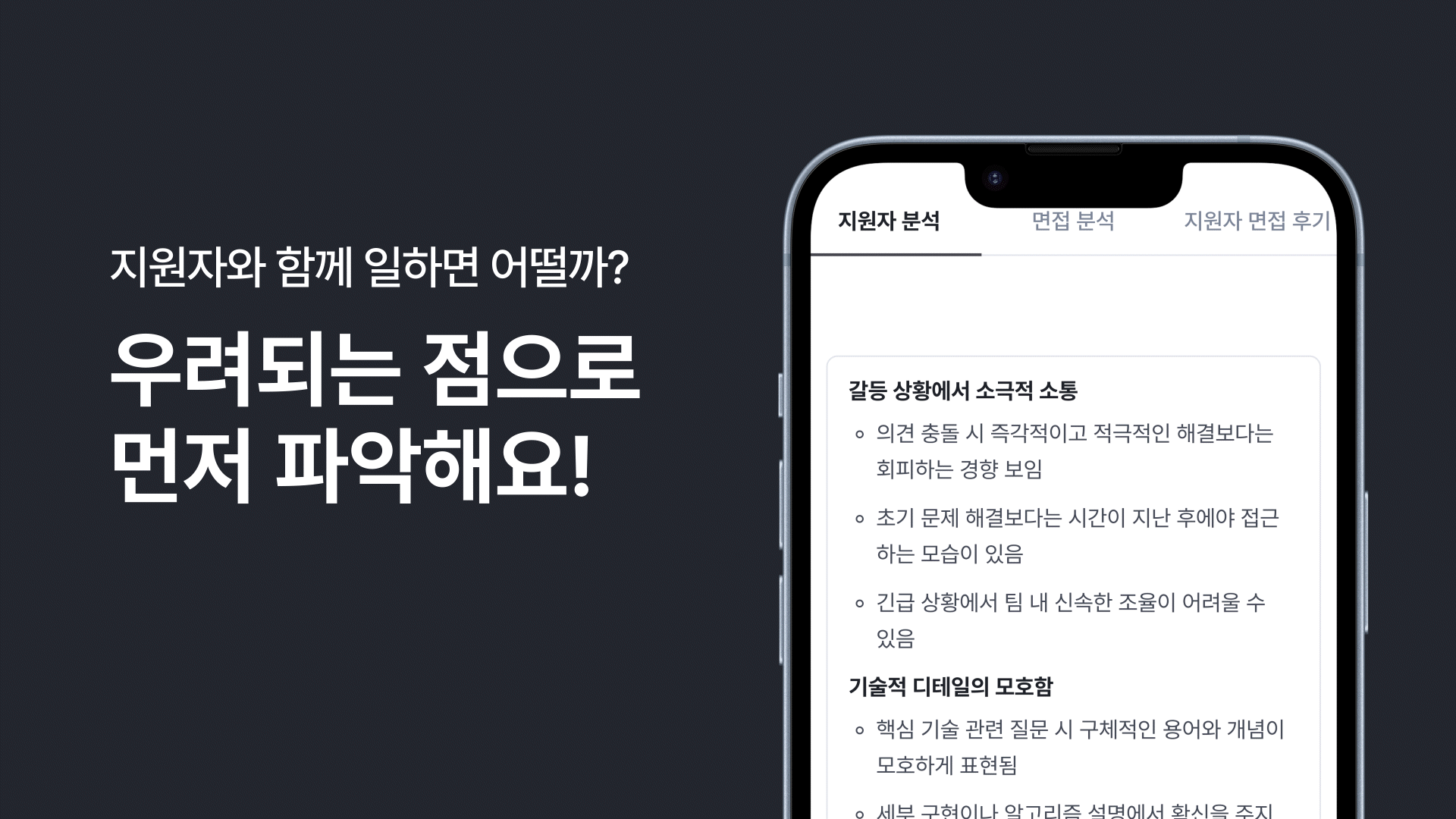 • 우려되는 점, 질문 이해도, 면접 주요 질문, 답변 등 면접 특화된 분석을 제공합니다.
