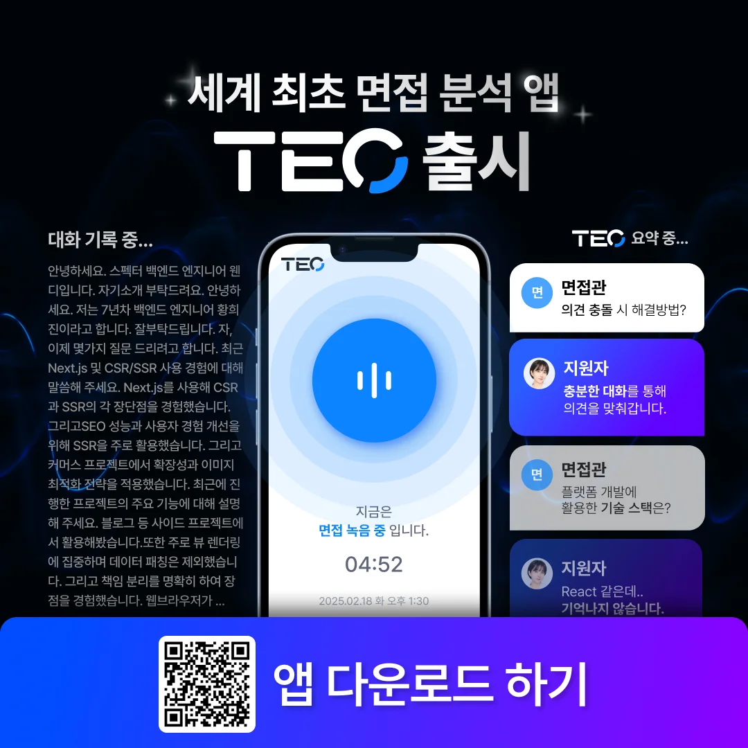 *포스트 최하단에서 세계 최초 면접 분석앱 TEO 베타 테스터를 신청하세요!