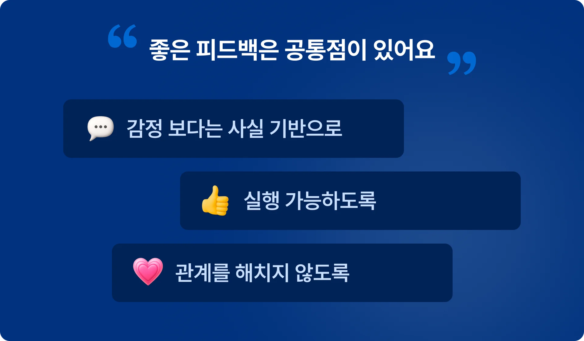 말의 구조는 다를 수 있지만, 이 세 가지 기준을 만족할 때 비로소 조직 안에서 피드백이 ‘기능’하기 시작합니다.