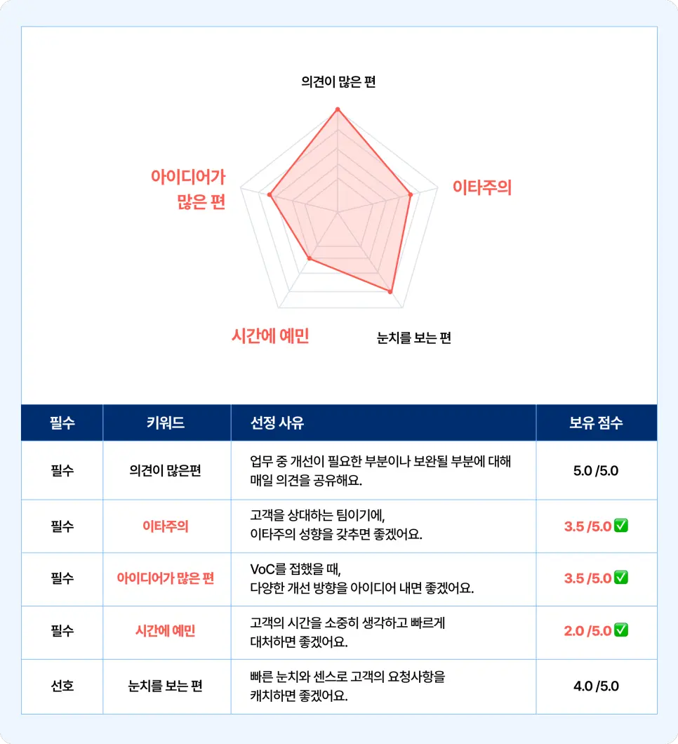 위의 예시와 같이, 기업이 채용 직무에 필요한 성향 키워드 5개를 선정하면, 지원자의 답변을 기반으로 각 성향의 보유 정도를 최대 5점까지 평가합니다.