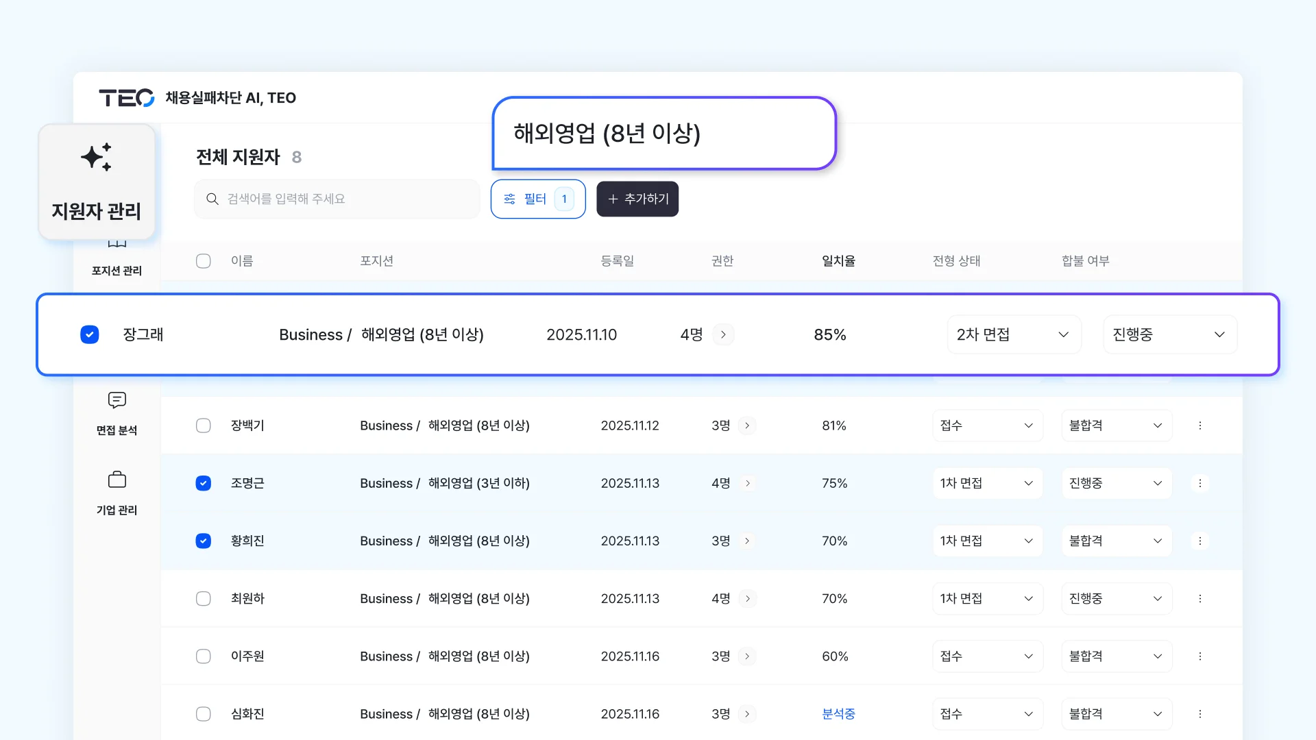 TEO는 기업의 인재상과 채용 공고를 기반으로 지원자 데이터를 분석해 우리 기업과 지원자가 얼마나 일치하는 지를 판단합니다.