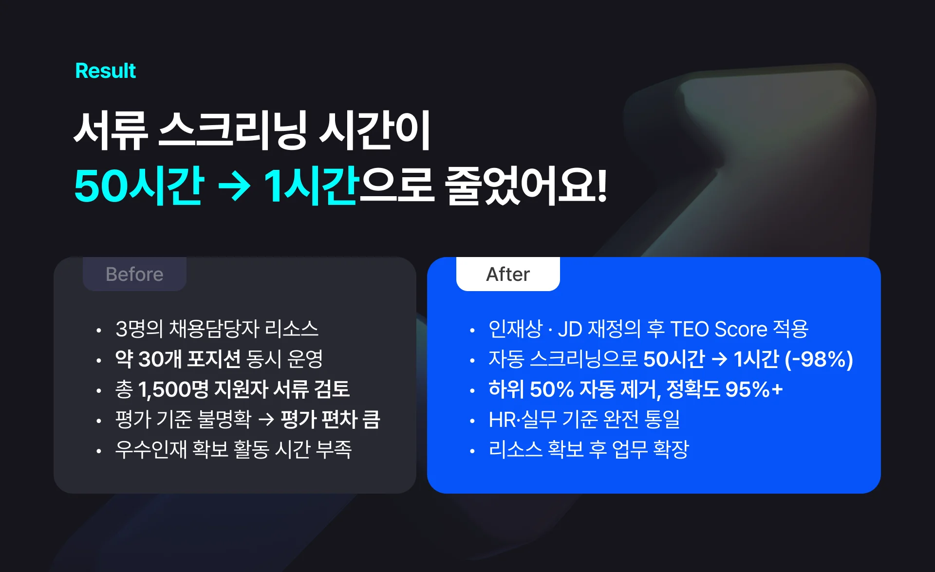 많은 조직이 AI 서류 스크리닝을 도입하는 이유는 업무 시간을 줄이기 위해서입니다.