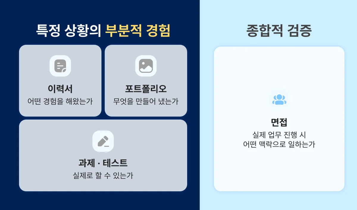 면접 | 경험 검증, 문제 해결 방식, | 사람에 의존, 구조화 부족 |