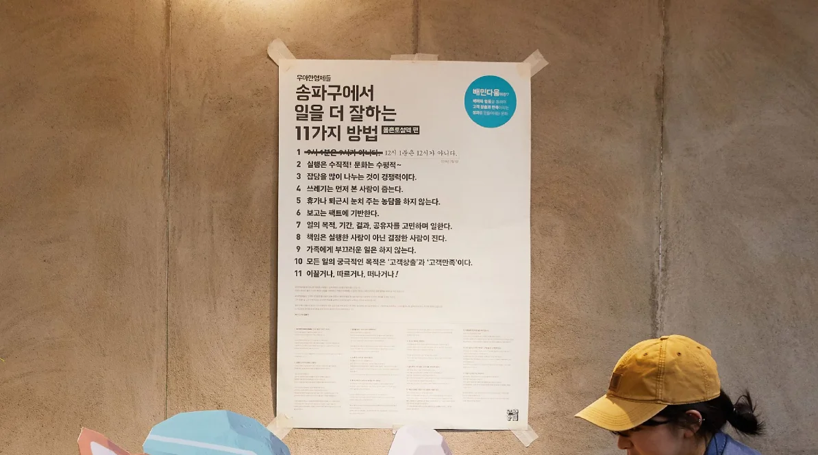 ‘송파구에서 일 잘하는 11가지 방법’은 배달의민족이 본사의 위치가 있는 송파구의 이름을 따와 만든 내부 지침으로, 구성원들이 회사의 가치와 문화를 공유하고 실천할 수 있도록 하는 가이드라인입니다.