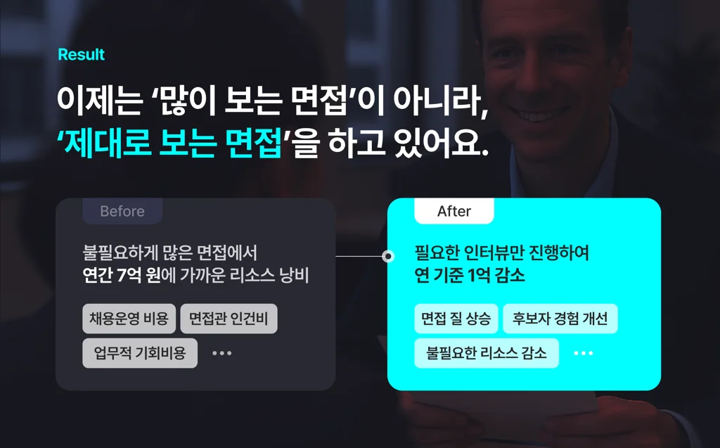 A 기업은 30개 포지션, 한 달 기준 30개의 직무 인터뷰와 컬쳐핏 인터뷰를 진행하고 있었습니다. 인터뷰를 위한 채용 운영 비용, 면접관 인건비, 그로 인한 업무적 기회비용 등 인터뷰에서 발생하는 비용만 연간 7억에 가까운 상황이었죠.