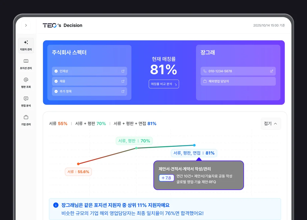 TEO는 지원자의 서류, 평판조회, 1차 면접, 2차 면접 각각의 데이터가 추가될 때마다 설정한 인재상, JD와의 적합도를 다시 계산합니다. 서류에서 부족한 부분이 면접에서 채워지기도 하고, 면접에서 드러나지 않았던 이슈가 평판조회 결과에서 발견되기도 합니다.