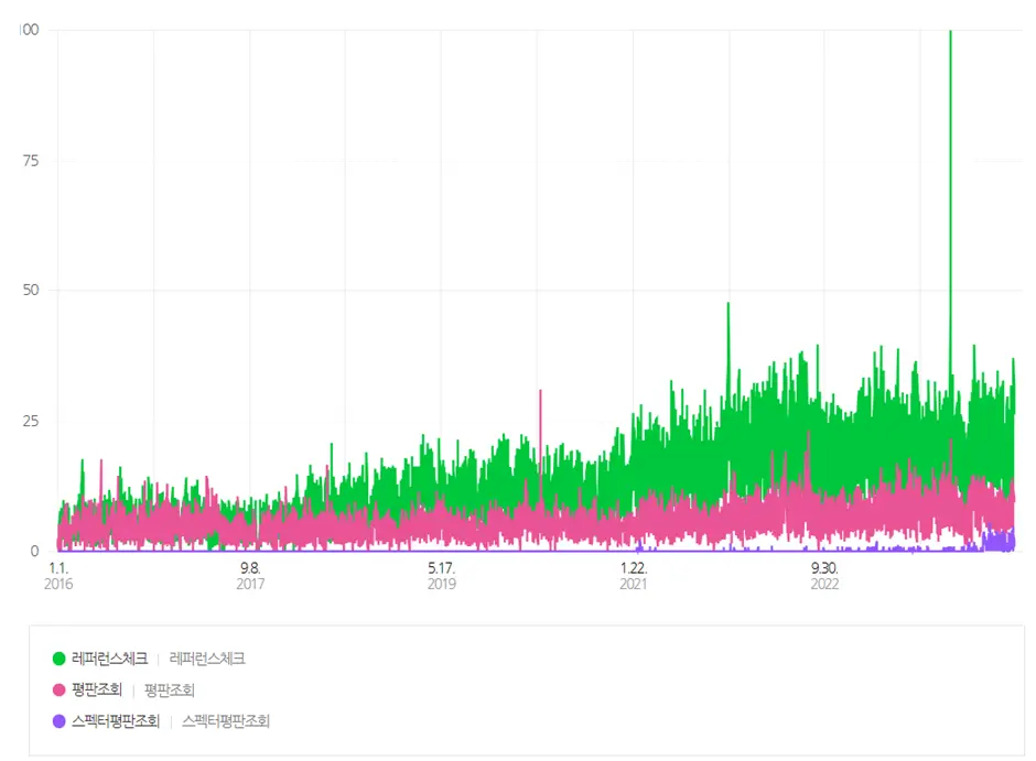 네이버 데이터랩 통계를 보면, 레퍼런스 체크는 2017년부터 증가세를 보입니다. 평판조회 용어도 꾸준한 검색량을 보이고, 스펙터 평판조회 서비스가 시작된 이후에는 스펙터 평판조회 서비스 검색어가 점차 증가해 2023년부터 본격적으로 언급량이 많아짐을 확인할 수 있습니다.