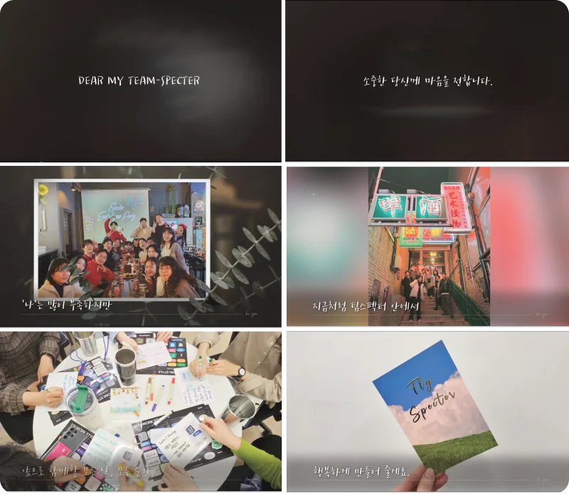 그리고 최전방에서 스펙터를 이끄는 Kay, Regina, Lisa의 깜짝선물을 준비했어요. 진심을 꾹꾹 눌러 담아 롤링페이퍼를 작성했고, CEO Kay와 COO Regina에게는 감사패도 준비했습니다. 상패를 받으며 감사의 마음과 더 잘해야겠다는 다짐하며 눈물을 흘렸고, 그 모습을 보며 함께 울기도 했습니다. 모두가 뭉클함이 솟았답니다.
