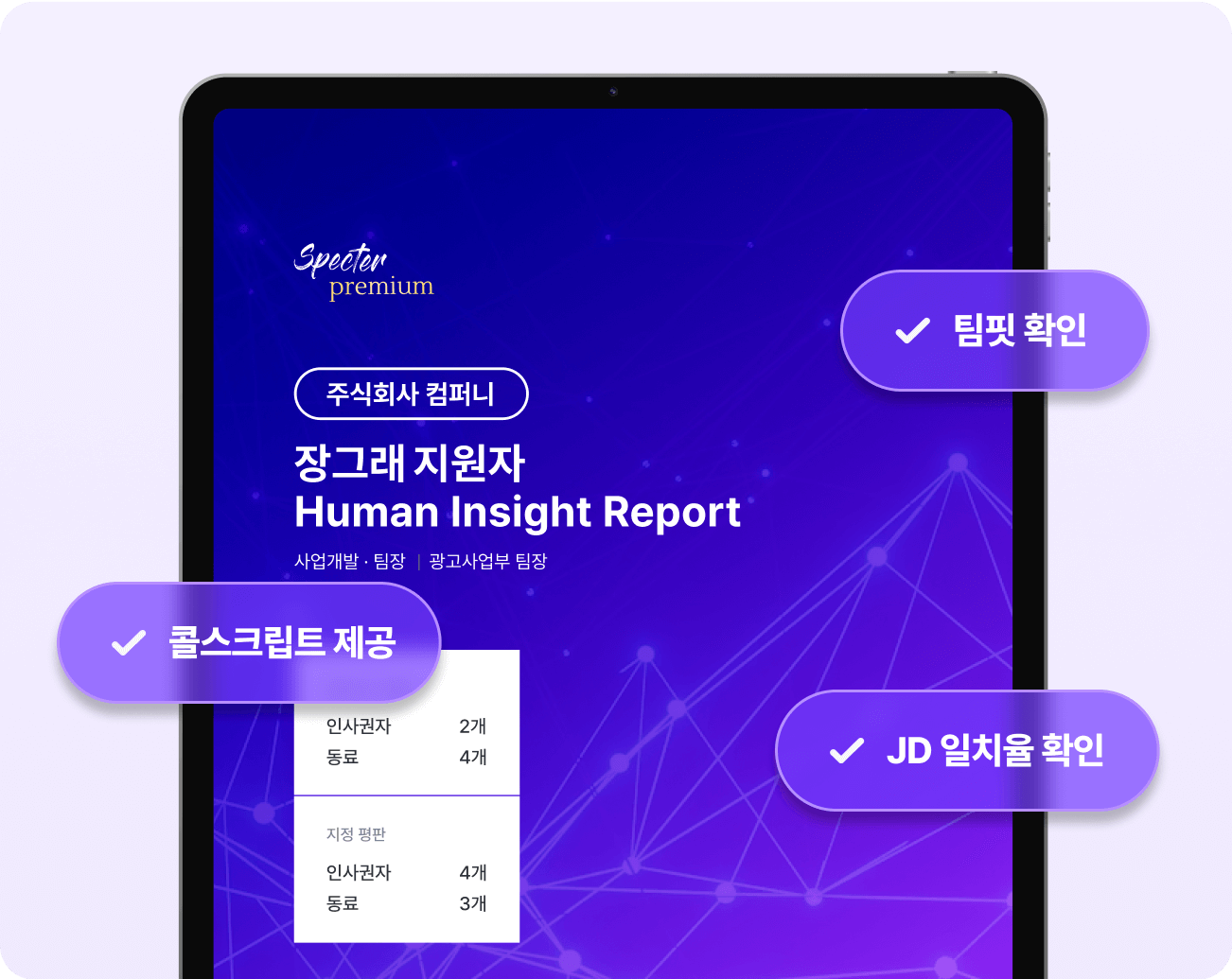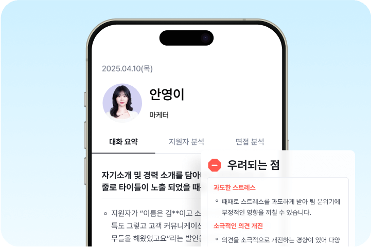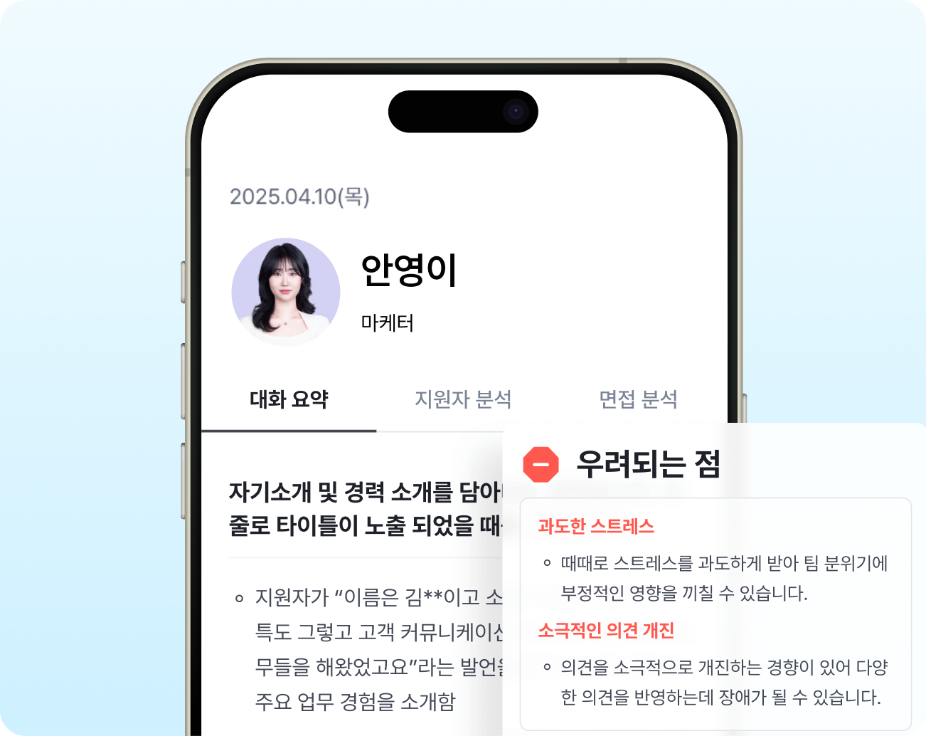 면접 대화 기록부터 함께 일할 때 우려되는 점까지 데이터로 확인해 보세요