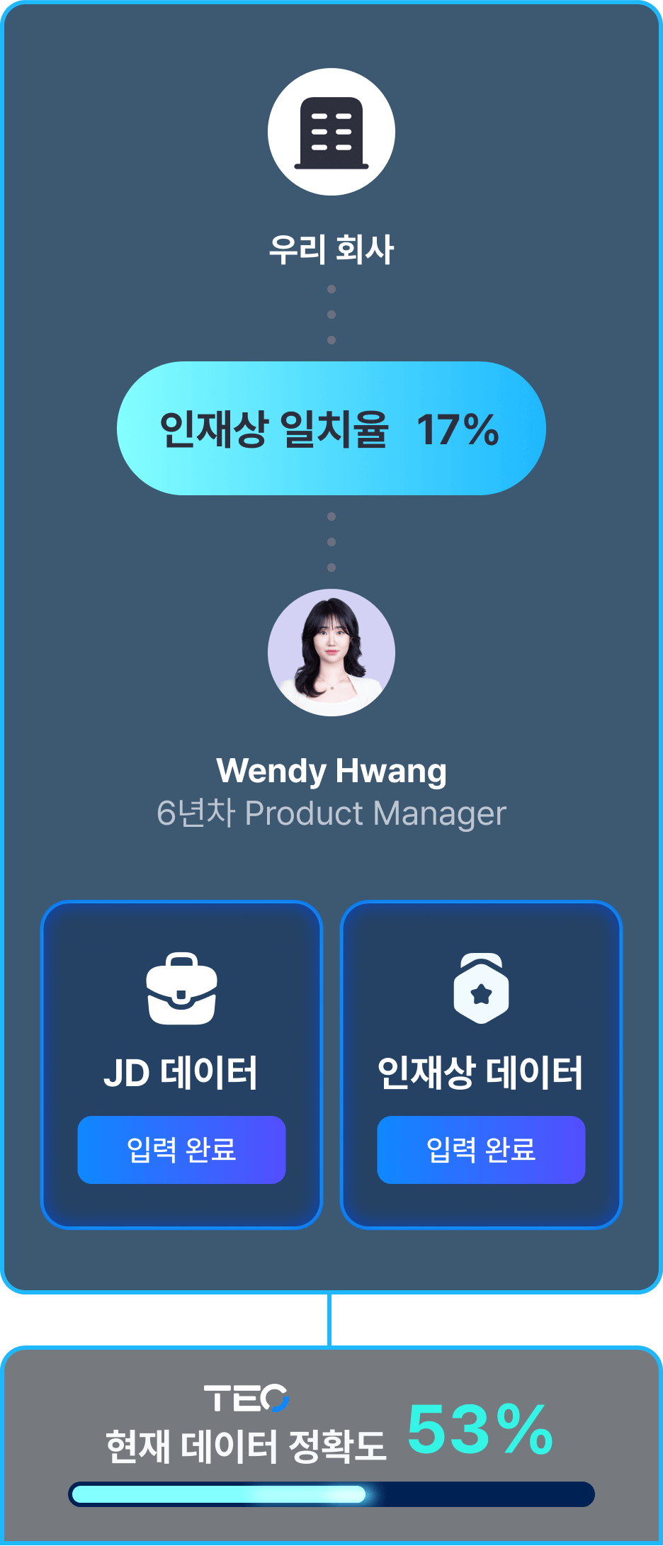 사람의 결정에만 의존해서 생기는 채용실패, AI 테오의 데이터 기반 분석으로, 실패 없는 채용을 실현하세요.사람의 결정에만 의존해서 생기는 채용실패,AI 테오의 데이터 기반 분석으로,실패 없는 채용을 실현하세요.